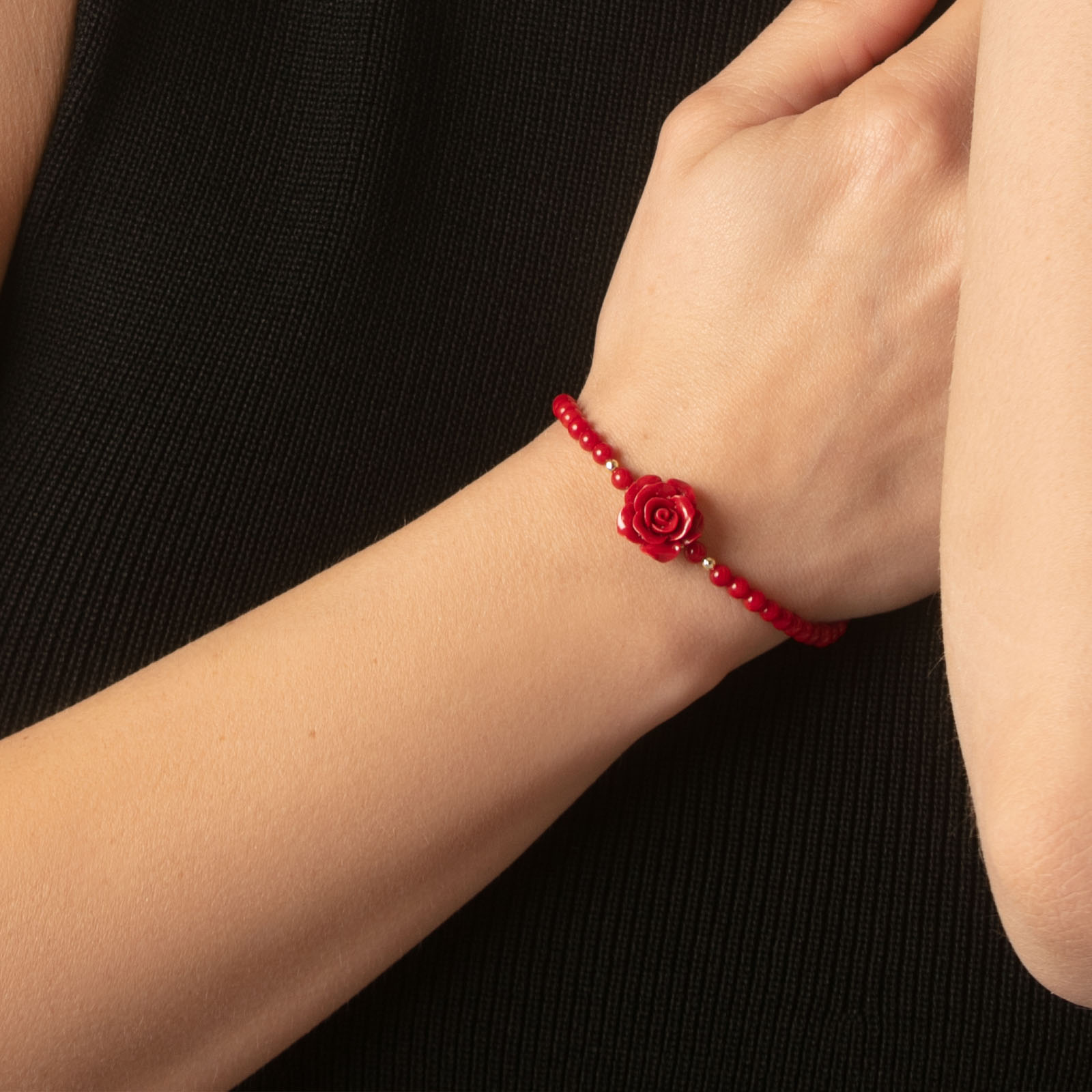 Bracciale in corallo bambù con rosa rossa su acciaio dorato