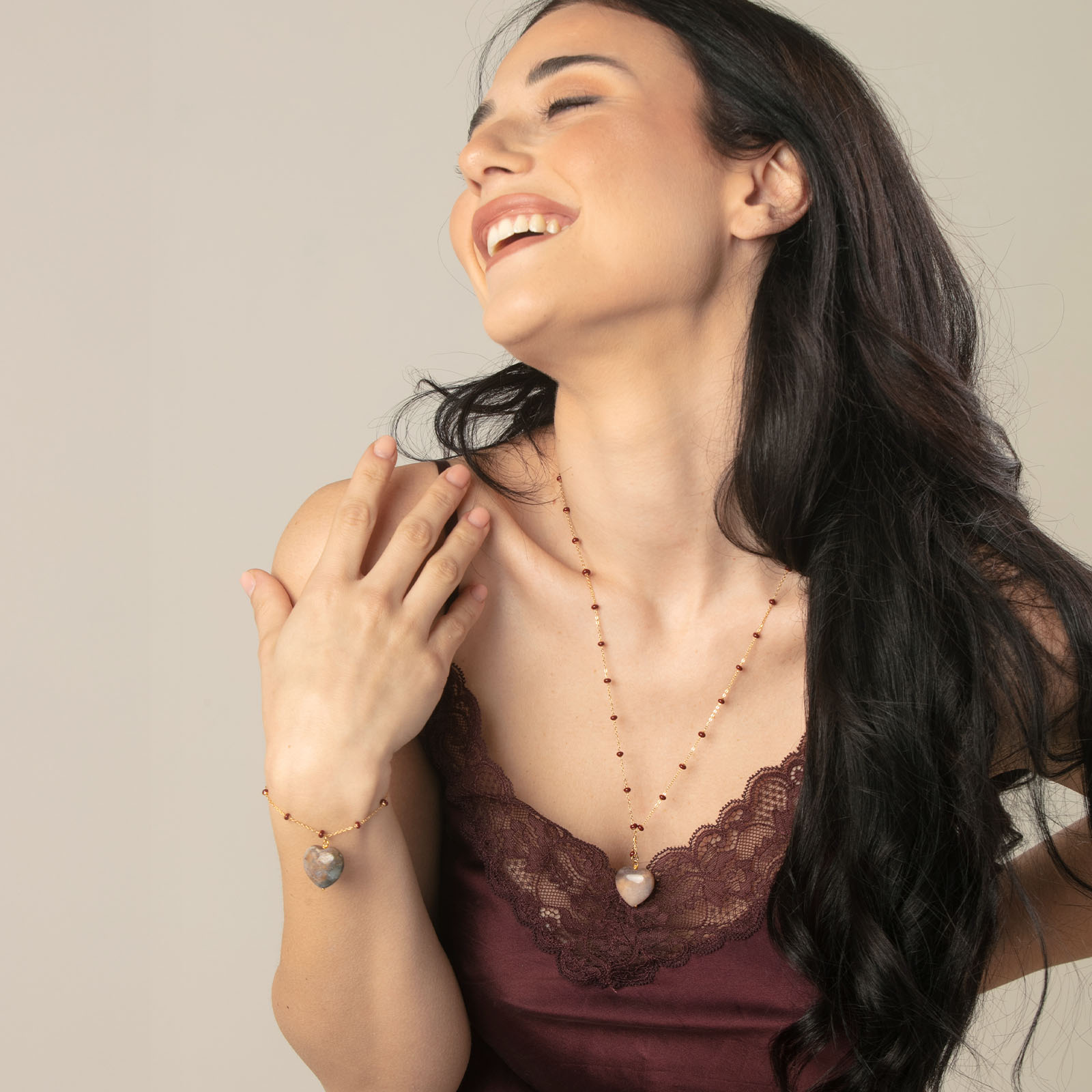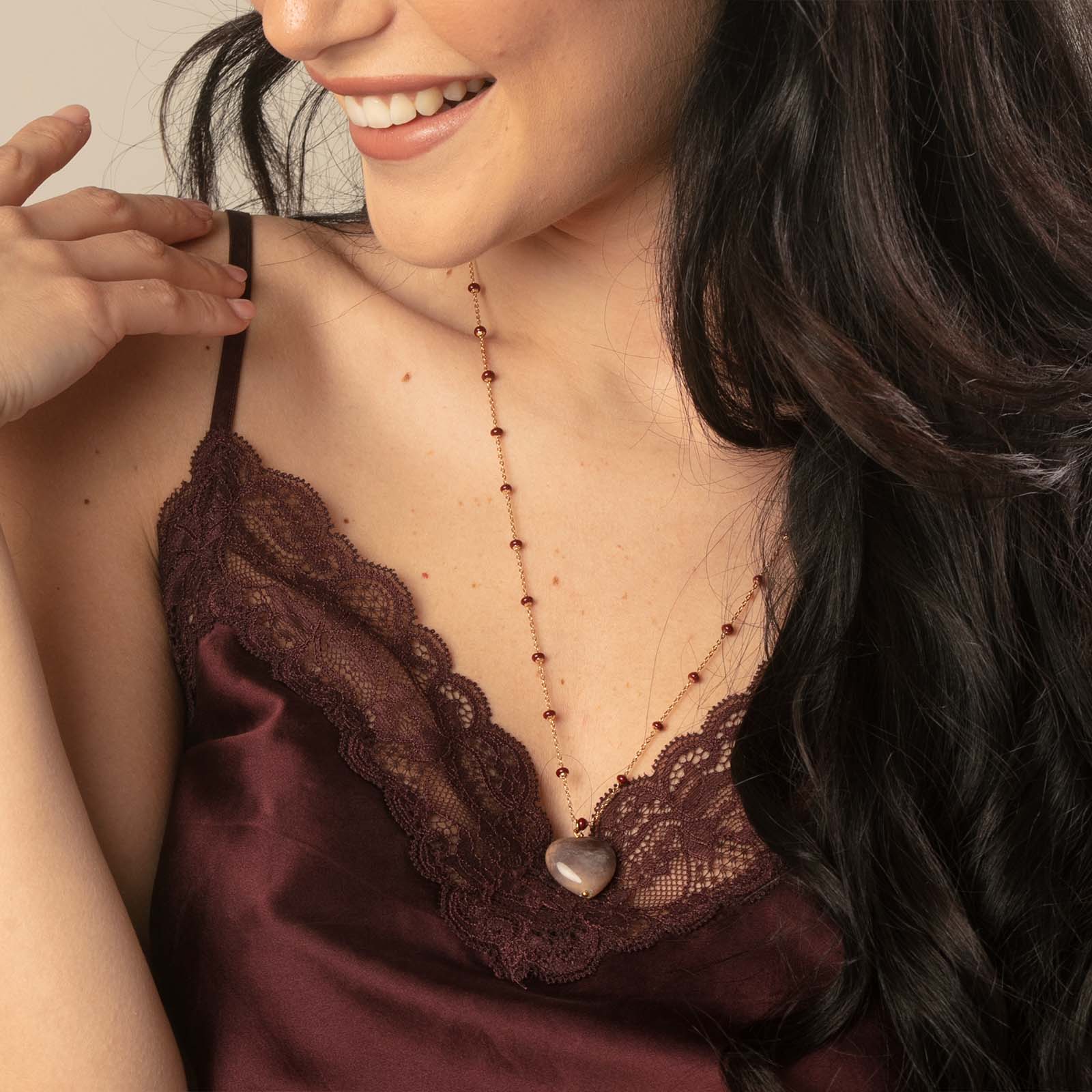 Collana con cuore bombato in agata vinaccia su catena con pallini bordò in acciaio dorato.