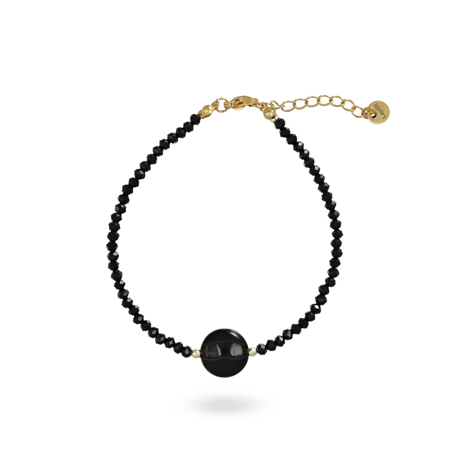 Bracciale con cristalli neri e centrale tondo in onice nero. Pallini in emetite gold.
