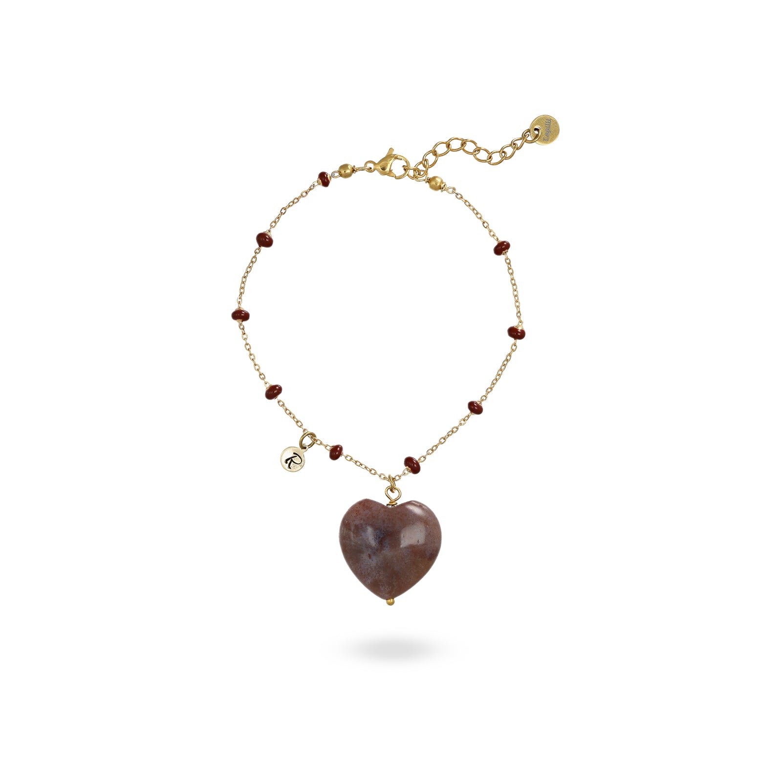 Bracciale con cuore bombato in agata vinaccia su catena con pallini bordò in acciaio dorato.