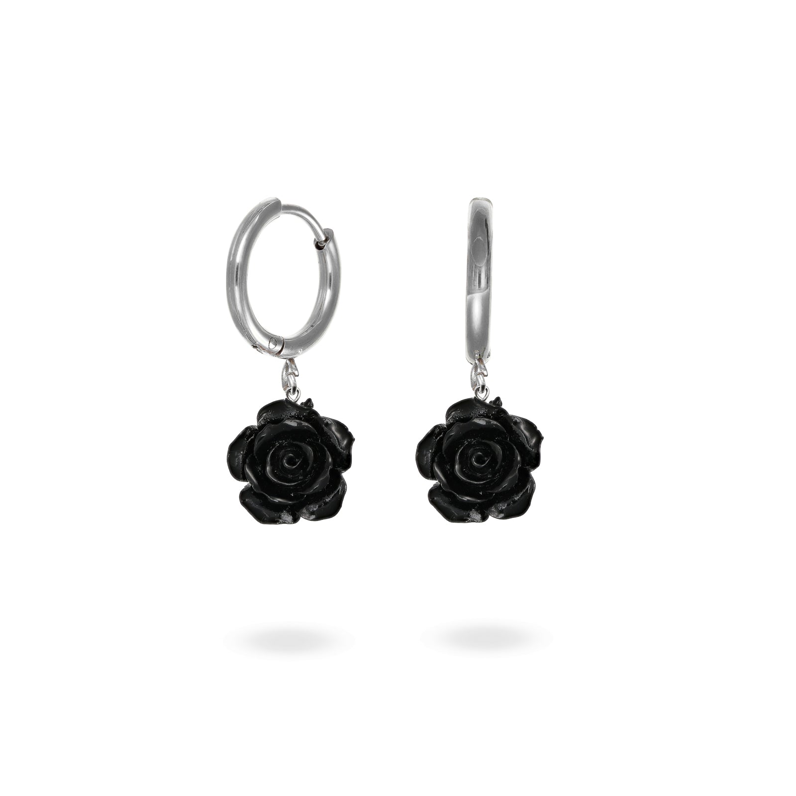 Orecchini a cerchio con rosellina in resina nera su cerchio in acciaio.