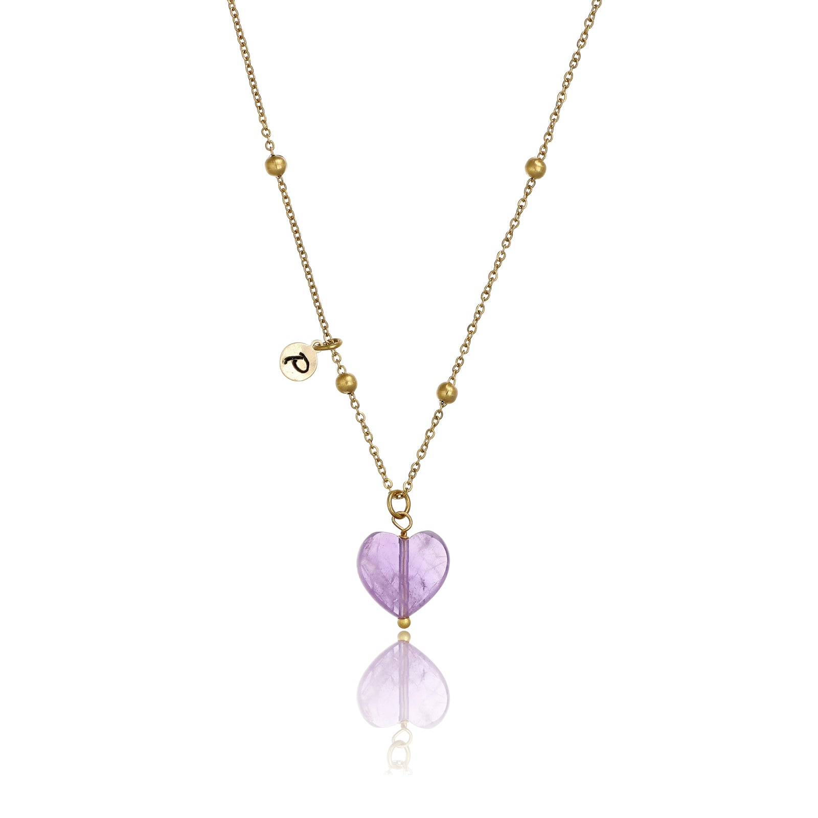 Collana con cuore in ametista e iniziale incisa con bulino manuale in acciaio placcato oro 18kt.