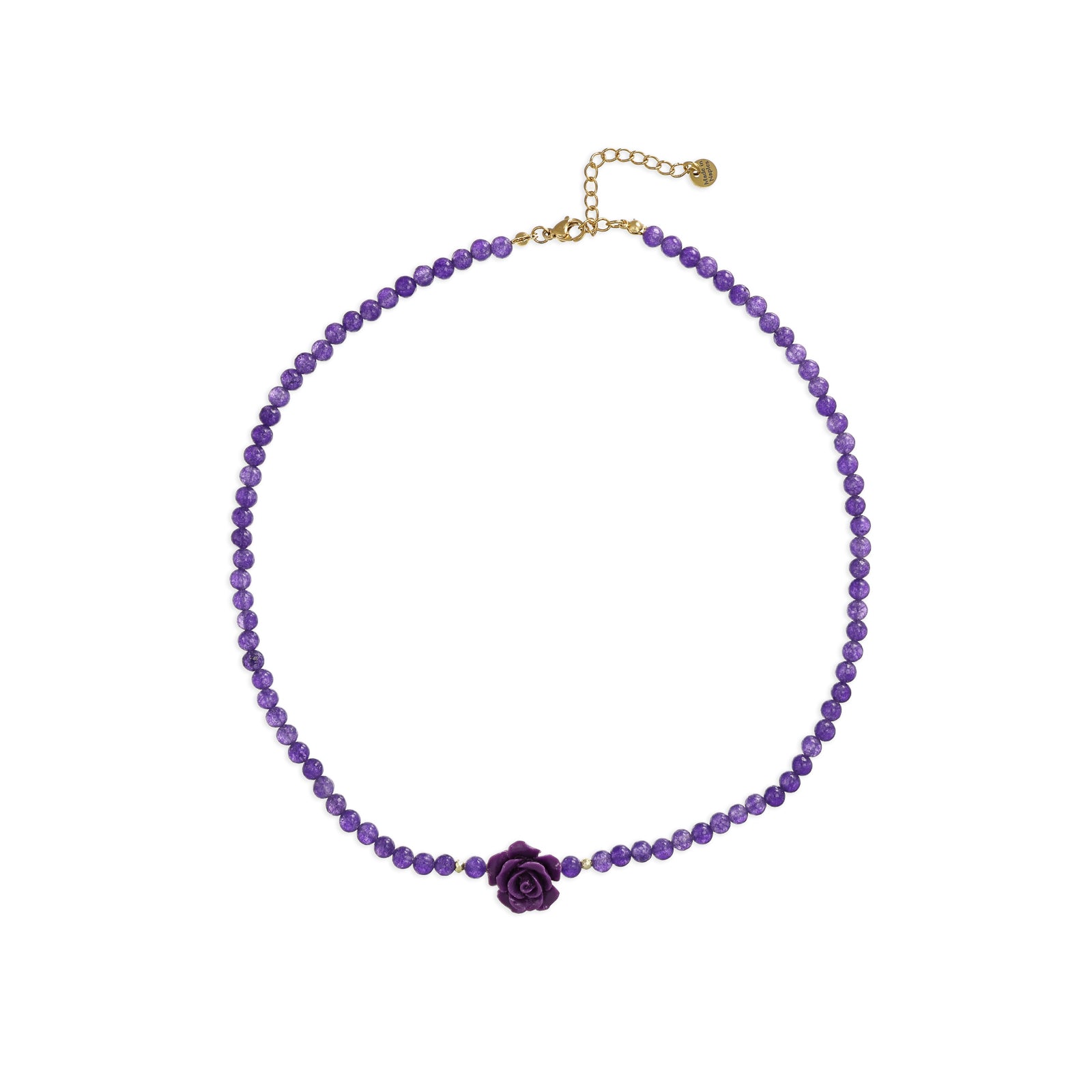 Collana in ametista con rosa viola centrale e pallini di ematite gold su acciaio dorato.