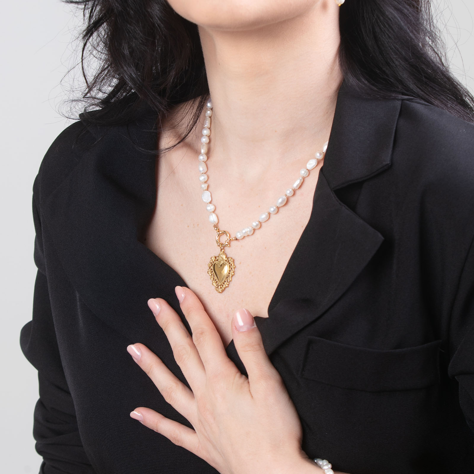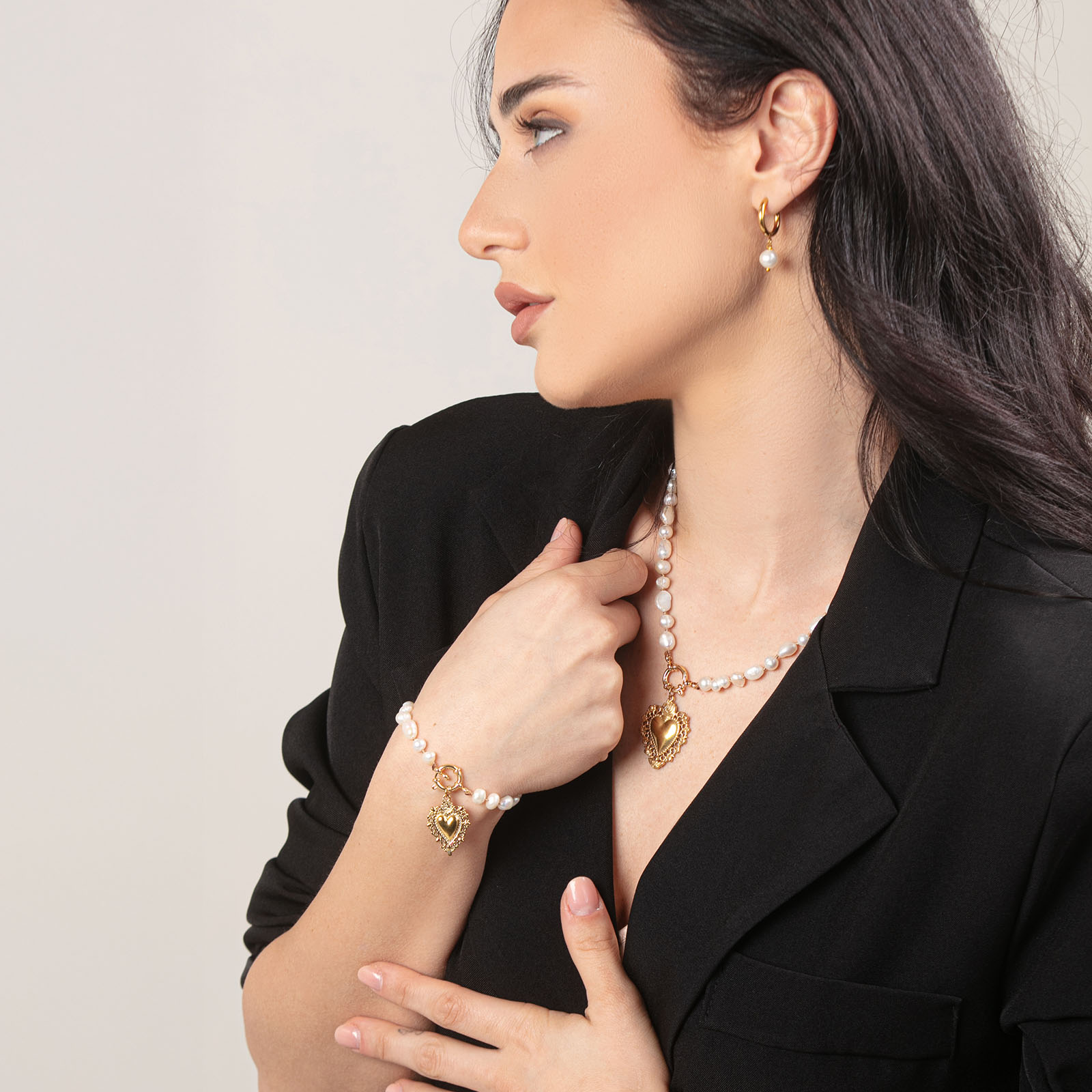 Collana in perle di fiume con ex-voto e anello in acciaio dorato.