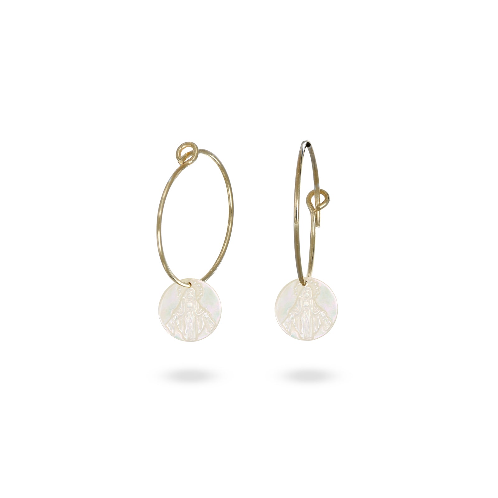 Orecchini con medagline raffiguranti Madonna del Rosario su cerchi in acciaio dorato.