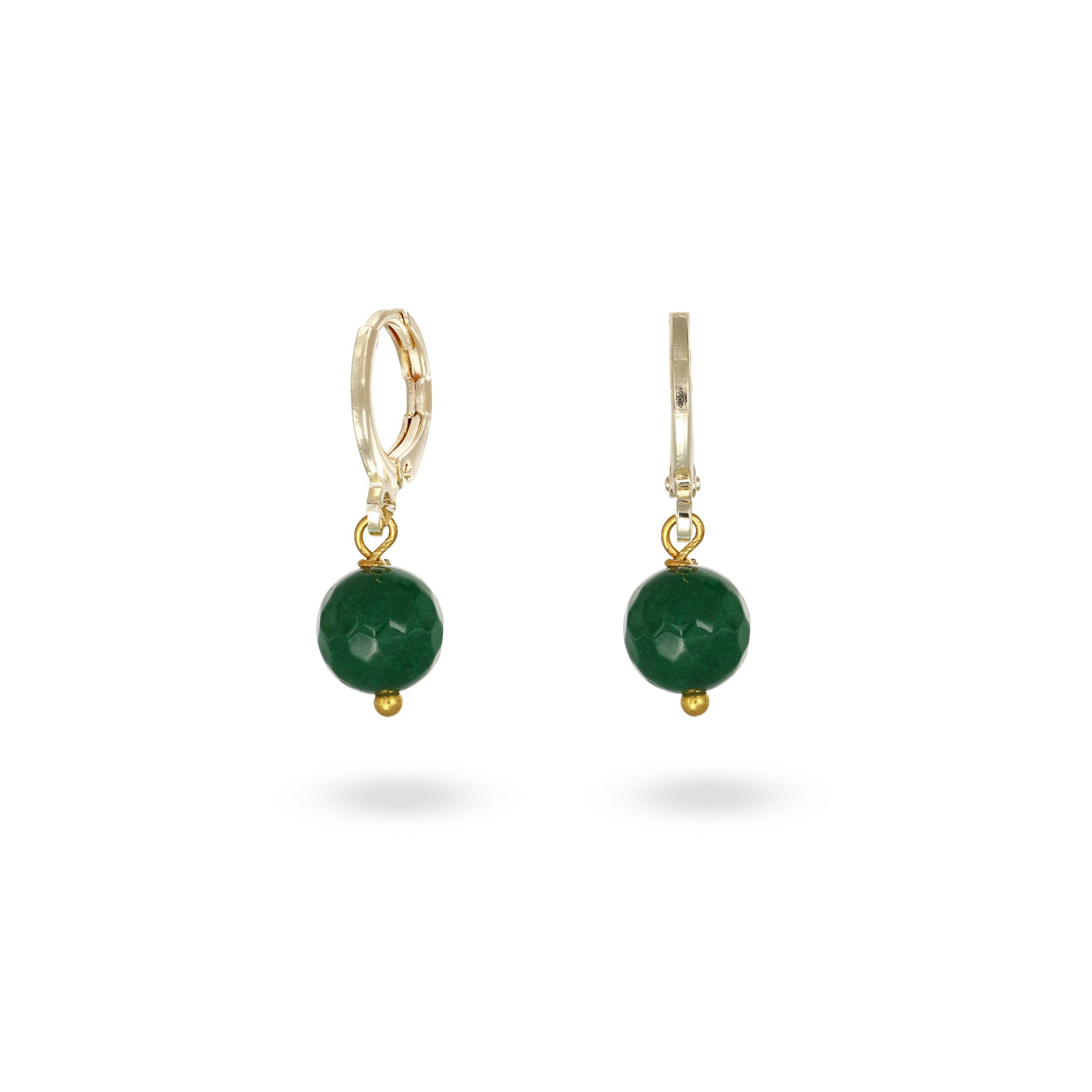 Orecchini a cerchio con sfera in agata verde faccettata su cerchio in acciaio dorato.