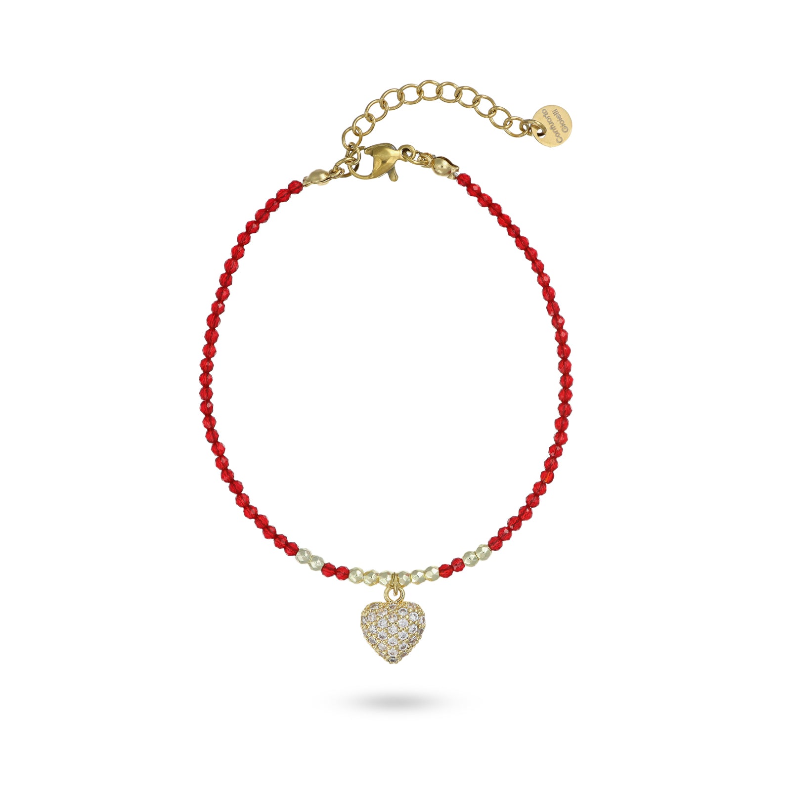 Bracciale cristalli rosso ed ematite gold e cuoricino zirconato in acciaio dorato