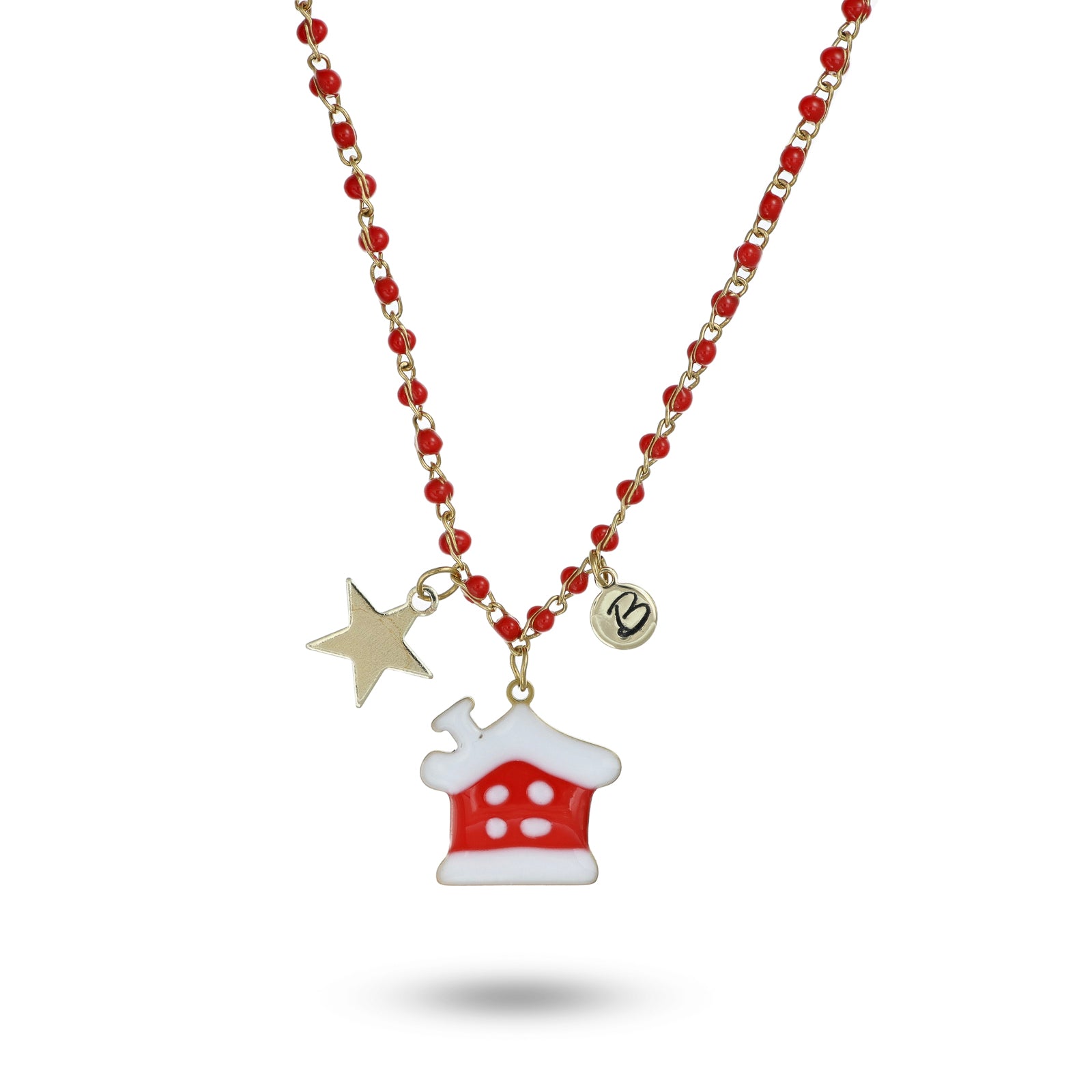 Collana con casetta smaltata e stellina su catena smaltata rosso in acciaio dorato. Iniziale incisa con bulino manuale.