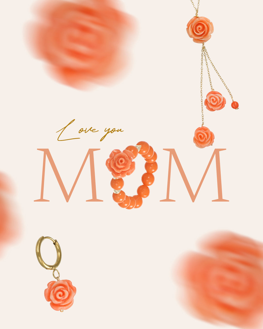 Una collezione pensata per celebrare la Mamma, con ciondoli a forma di rosa, disponibili in rosso passione o rosa delicato, catene in acciaio dorato, cristalli Swarovski, ematite e corallo bambù.