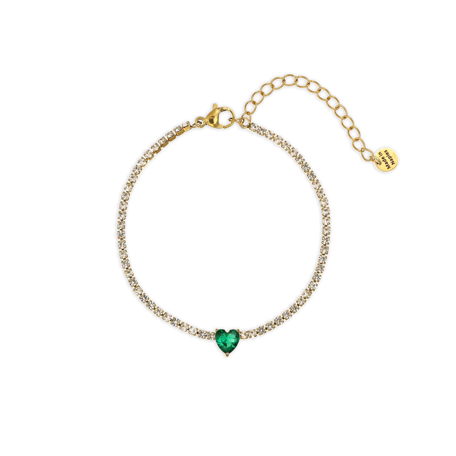 Bracciale tennis con cuore centrale color smeraldo e cristalli in acciaio dorato