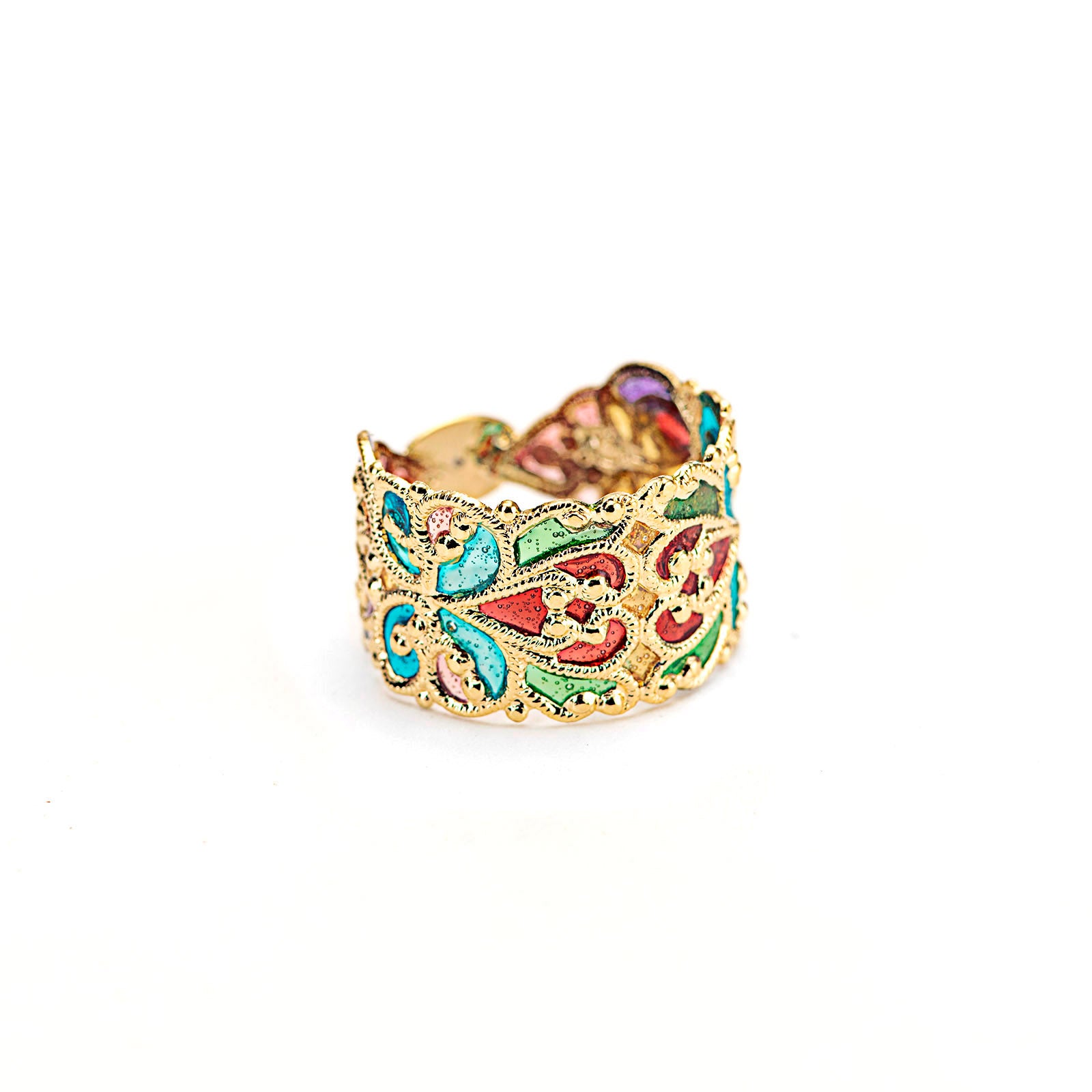 Anello a fascia in filigrana di ottone placcato oro 18kt e decorato a mano con smalti.