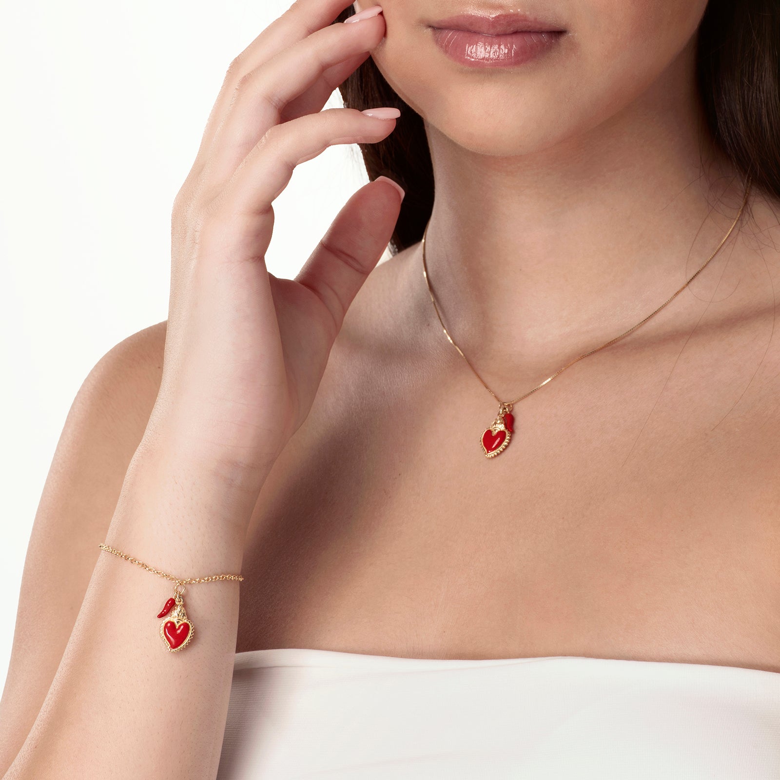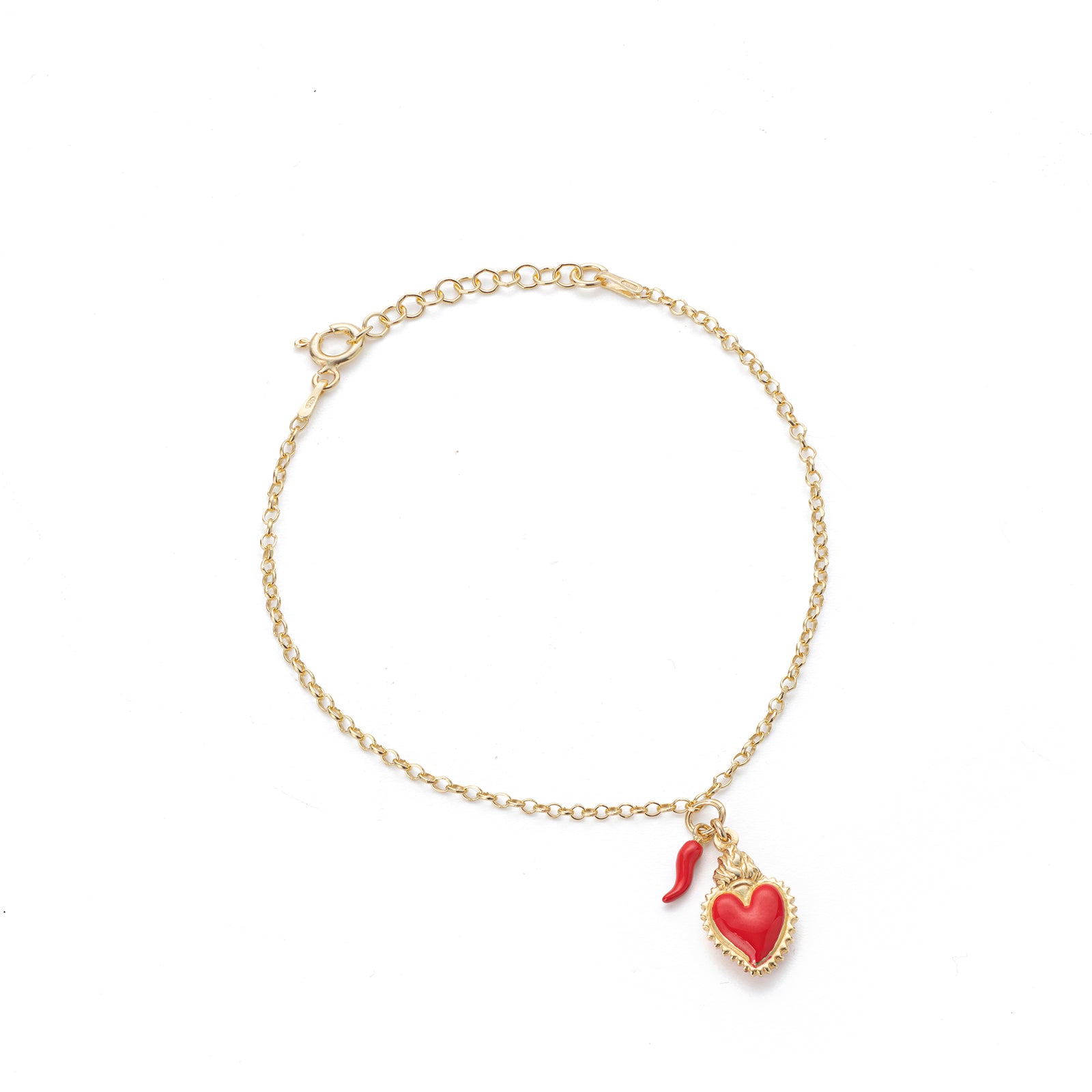 Bracciale rolò con cuore votivo e corno portafortuna in argento 925‰ placcato oro 18kt.